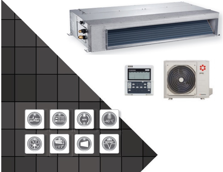 Канальная сплит-система on-off полупромышленного типа. Монтируется в подшивные и подвесные потолки бытовых и коммерческих помещений: офисы, квартиры, торговые здания, холлы, гостиничные комплексы и т.д. Имеется функция «подачи свежего воздуха с улицы». Возможна доработка зимним комплектом, для эксплуатации устройства при низких температурах до – 40 °С наружного воздуха. Воздушный фильтр предотвратит попадание пыли, насекомых и пуха в помещение.