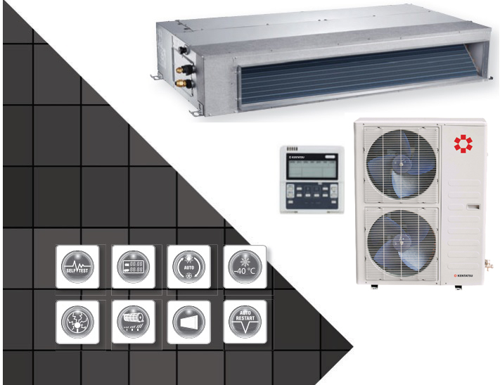 Канальная сплит-система on-off полупромышленного типа. Монтируется в подшивные и подвесные потолки бытовых и коммерческих помещений: офисы, квартиры, торговые здания, холлы, гостиничные комплексы и т.д. Имеется функция «подачи свежего воздуха с улицы». Возможна доработка зимним комплектом, для эксплуатации устройства при низких температурах до – 40 °С наружного воздуха. Воздушный фильтр предотвратит попадание пыли, насекомых и пуха в помещение.