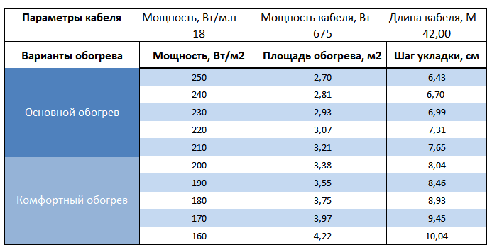 Самостоятельно высчитать какую площадь может обогреть секция нагревательного кабеля, нужно мощность секции разделить на вид обогрева (комфортный, основной или холодных помещений) и получим количество квадратных метров обогрева пола.