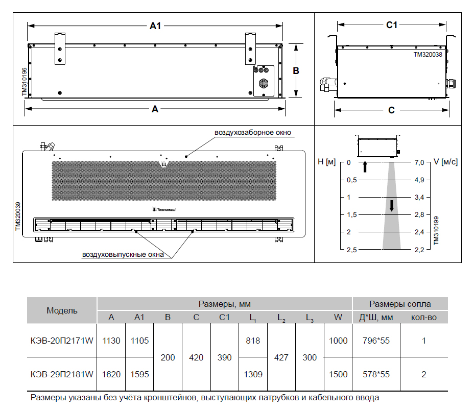 Условная тепловая мощность водяной завесы указанна в кВт.ч при температуре подаваемой воды +95°С / её охлаждением до +70°С / температура окружающей среды +15°С. При изменение любого из показателей мощность будет отличаться от заявленной. (См. технические характеристики модели)
