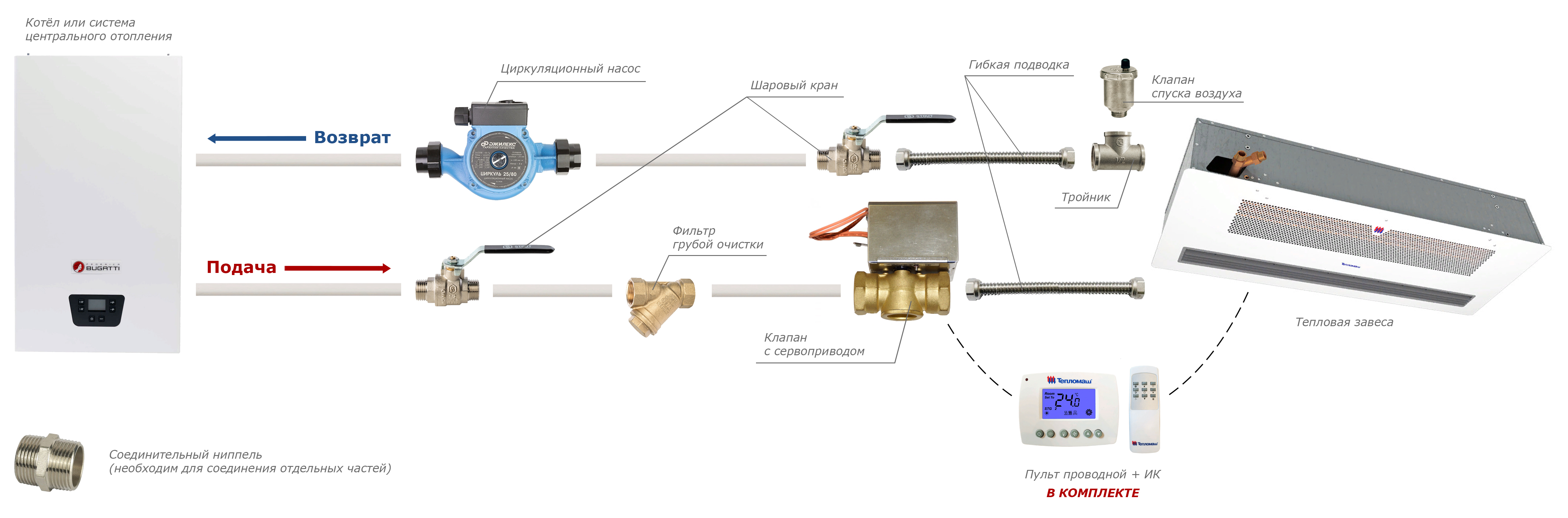 - Опциональное подключение клапана с сервоприводом меняет принцип работы: клапан, по команде термостата перекрывает или открывает подачу теплоносителя, вентилятор продолжает работу.