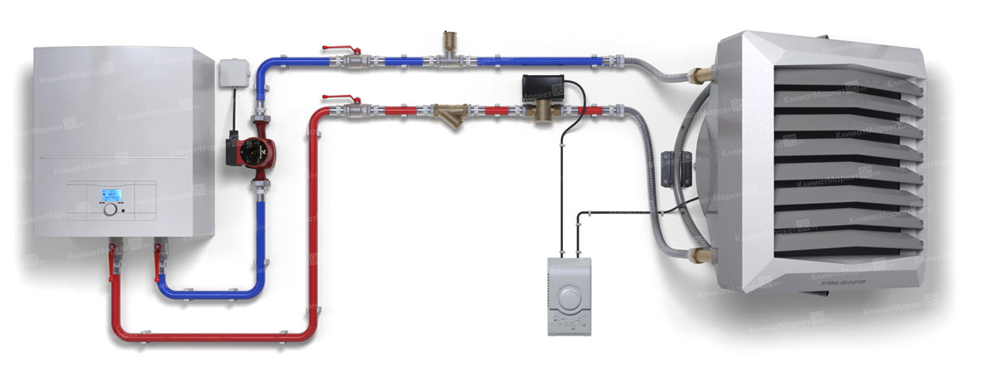 Применяется для обогрева производственных, складских, торговых помещений, спортивных сооружений, птицеводческих и животноводческих комплексов. Подключатся к источнику горячего водоснабжения или отопления. Устанавливается на стену или потолок. Оснащен двигателем переменного тока АС с 3-ступенчатым регулированием мощности.